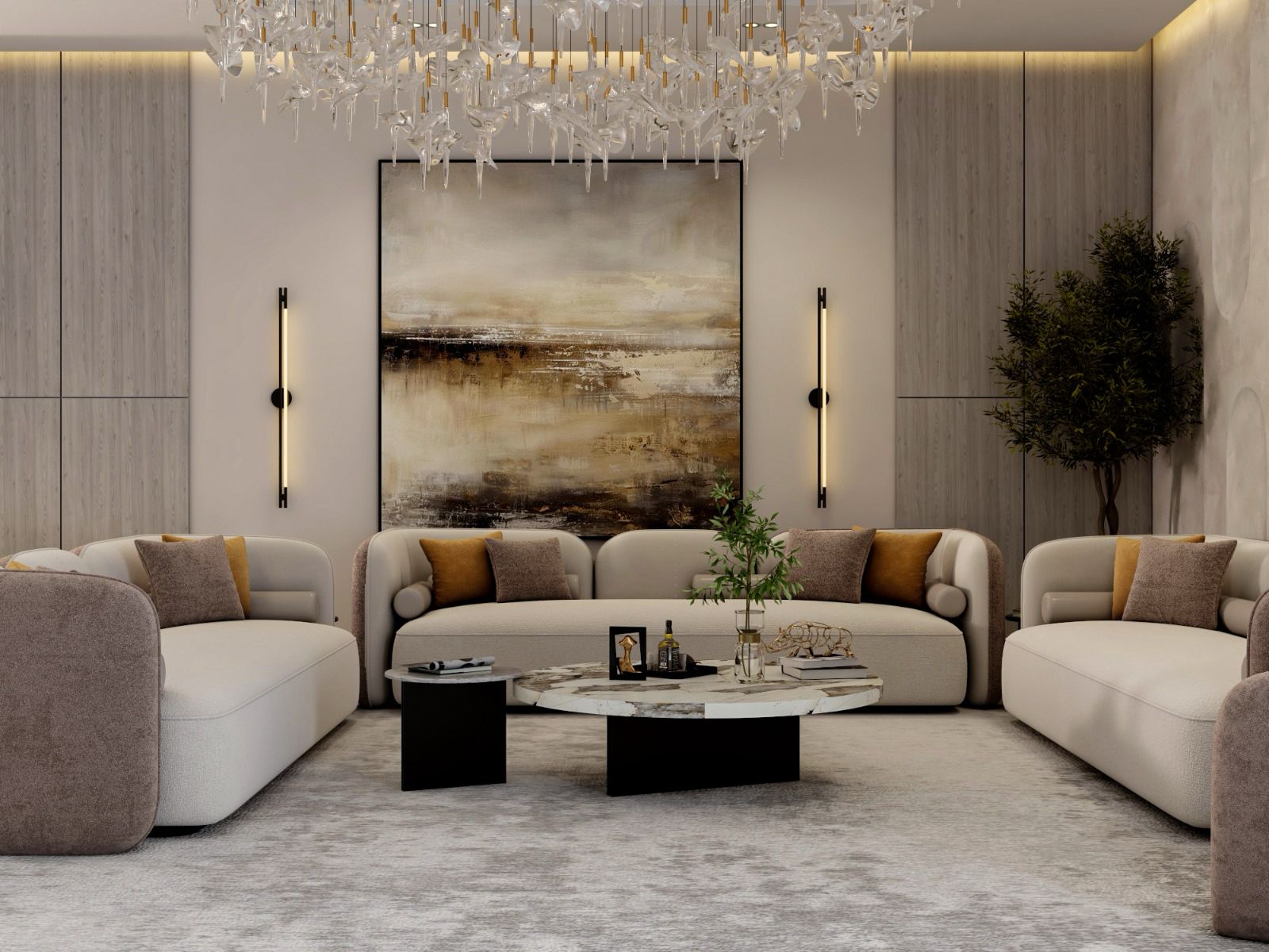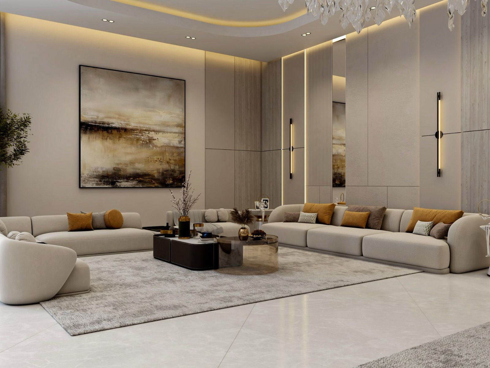 النتيجة النهائية: غرفة معيشة متكاملة تجمع بين الراحة البصرية والثراء المادي والأناقة العصرية.