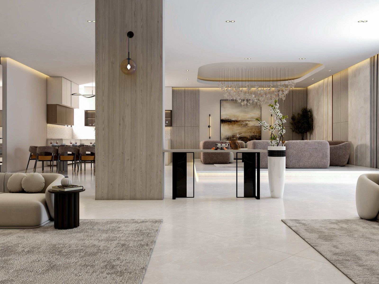 أما الطاولة الوسطى فهي من رخام بيج طبيعي مع قاعدة معدنية سوداء تُكمل المشهد العصري الأنيق.